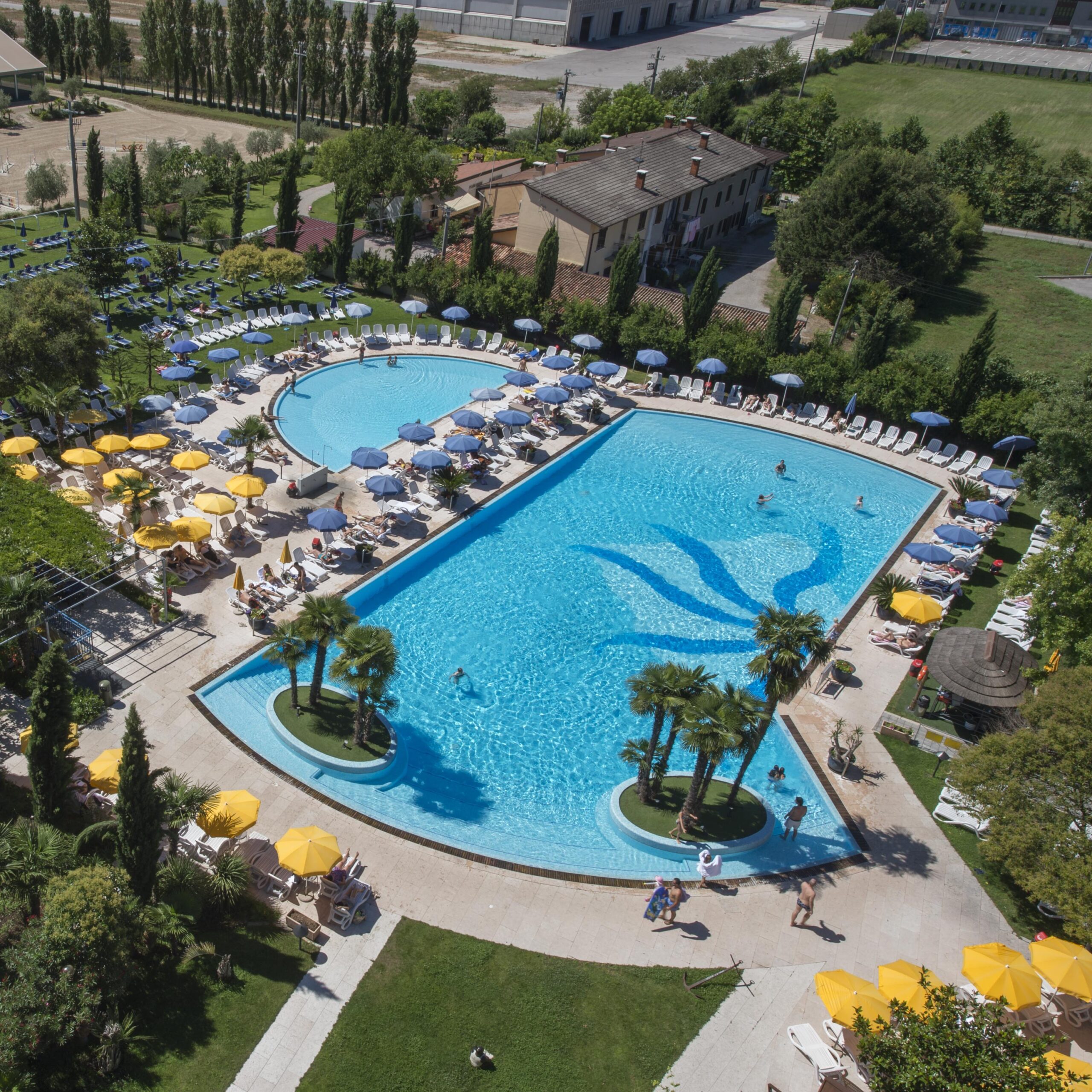 - una piscina esterna con vasca per bambini, circondata da una zona verde con lettini e ombrelloni e un bar a disposizione